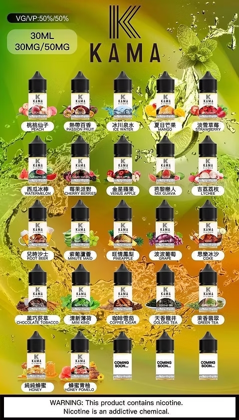 ✨KAMA(卡瑪)煙油系列以創意果香、經典茶韻與成熟調性為核心,推出高濃度尼古丁鹽 30ml 小煙專用煙油,適合搭配各類注油小煙設備。每一款口味皆經過精密調香,無論是夏日清涼系、濃郁甜果系、還是低調茶香與菸草調性,都呈現極佳還原度與喉感滑順的吸入體驗。從年輕新手到老煙油玩家都能在這個系列找到心中最對味的一瓶。