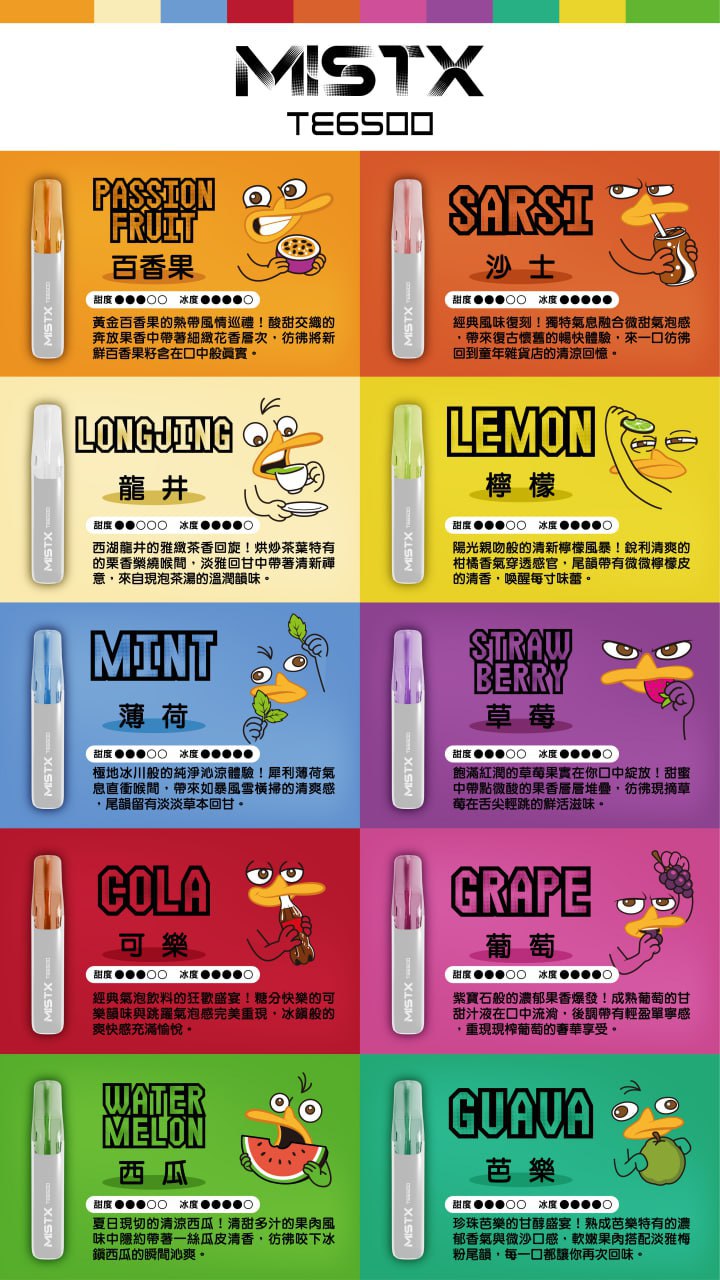 MISTX TE6500 鴨嘴獸,是一次性電子煙裡少見的「潮玩級作品」。它不是只有口味多、續航久而已,而是第一次把一次性的外觀做到真正有「收藏價值」。每一支都有不同的鴨嘴獸表情、可愛又帶點中二感的潮玩風格,你拿在手上的不只是電子煙,更像是一隻陪你出門的小夥伴。它的外型成功吸引目光,但真正讓人驚訝的是——它的內在比外表更強。