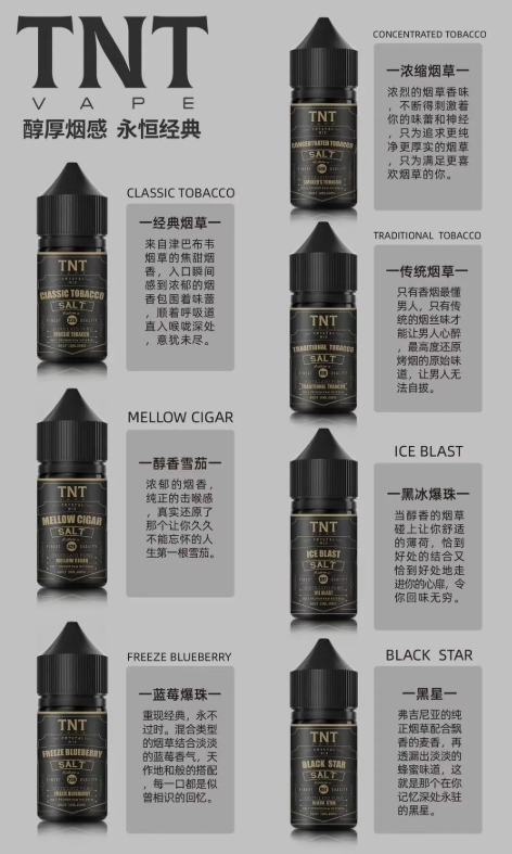 SANDI 所推出的 TNT 系列,是專為重口味與煙草愛好者設計的鹽油產品線。這系列煙油主打「還原真實香菸風味」與「經典混合型調香」,在保留傳統煙草醇厚感的同時,搭配各式果香、奶香與薄荷等元素,提升層次與口感豐富度。每瓶皆為 40MG 高濃度尼古丁鹽設計,適合搭配小煙設備使用。